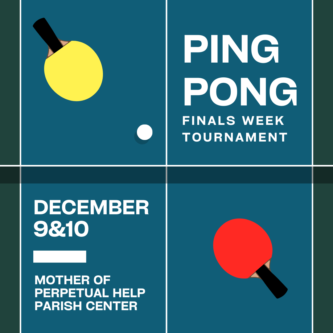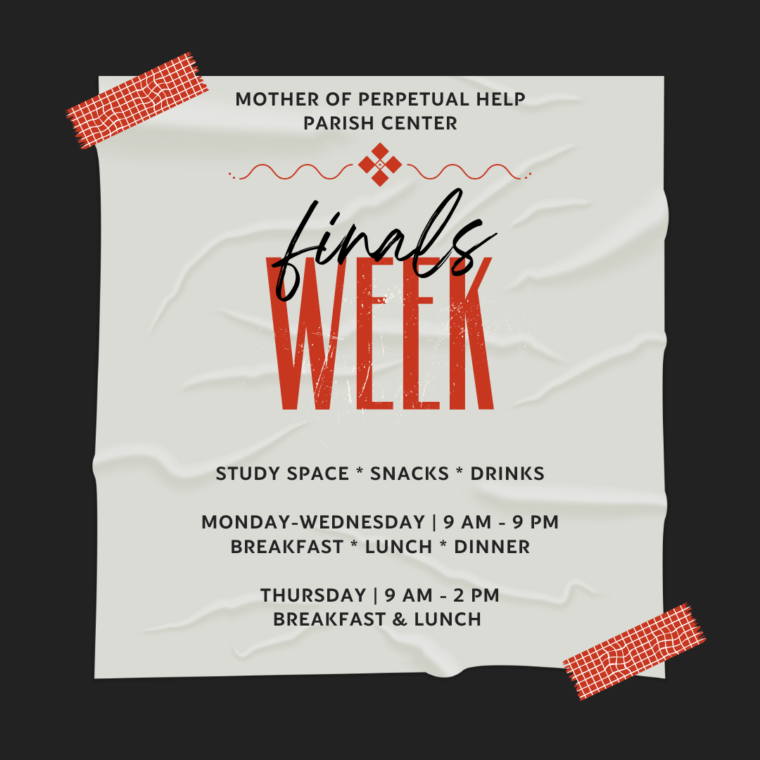9 am - 9 pm Finals Week Study Space at Mother of Perpetual Help Parish Center (Breakfast, Lunch and Dinner served)